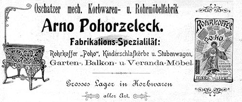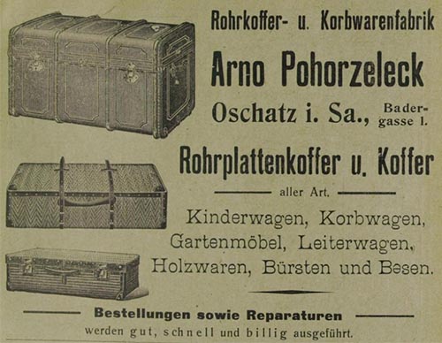 ![]() Korbmachermeister Arno Pohorzeleck aus Einwohnerverzeichnis Oschatz 1904 ![]() Arno Pohorzeleck aus „Erinnerungsblatt an das Heimatfest zu Oschatz“ 1906 ![]() Reisekoffer- und Korbwarenfabrik Arno Pohorzeleck aus Einwohnerverzeichnis Oschatz 1911 |