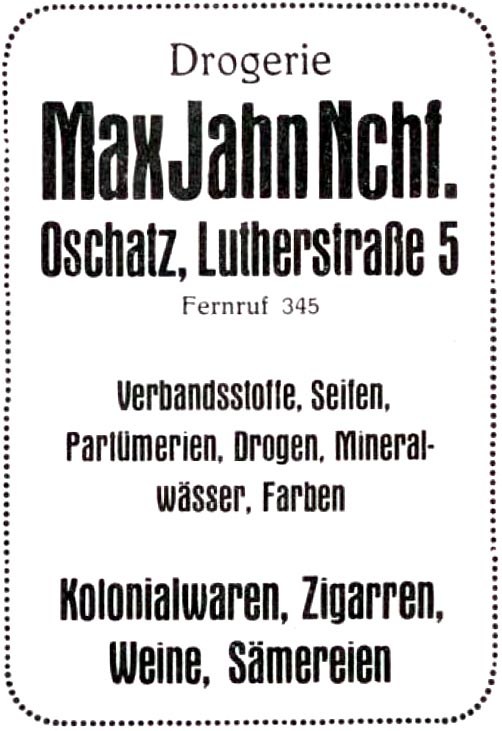 ![]() Richard Naumann, Emil Rocher Nachf. aus Einwohnerverzeichnis Oschatz 1904 ![]() Paul Kretzschmar aus „Erinnerungsblatt an das Heimatfest zu Oschatz“ 1906 ![]() Hugo Lorenz aus Einwohnerverzeichnis Oschatz 1904 ![]() Richard Marthaus aus Einwohnerverzeichnis Oschatz 1895 ![]() F.W. Bergmann's Nachfolger, Inhaber Otto Ehlert aus „Erinnerungsblatt an das Heimatfest zu Oschatz“ 1906 ![]() Delikatessgeschäft Robert Hardt aus Militäradressbuch für Sachsen, XII. u. XIV Armeecorps, Ausgabe 1909 ![]() Eugen Pohl, vormals Wilhelm Kümmel aus Einwohnerverzeichnis Oschatz 1922 |