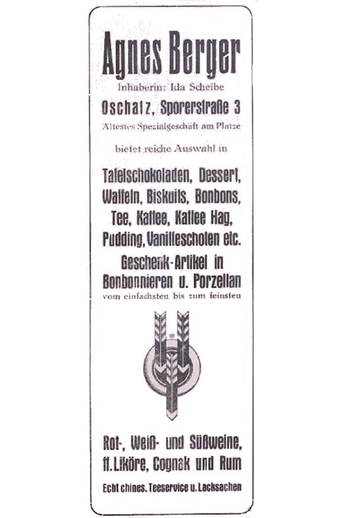 ![]() Agnes Berger aus Einwohnerverzeichnis Oschatz 1904 ![]() Agnes Berger, Inhaberin Ida Scheibe aus Einwohnerverzeichnis Oschatz 1931 |