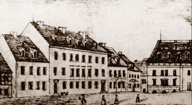 heute Sporerstraße), der Stadtschule am Kirchplatz (Bild 3) und der Kirchgasse (Bild 4, heute Kirchplatz). Aus dem Souvenirblatt von 1849 Zeichnung und