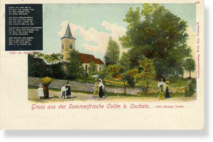 Diese Ansicht zeigt die Dorfkirche von Collm und die 1000jährige Linde. Auf der Tafel, die bei der Linde angebracht war, war zu
