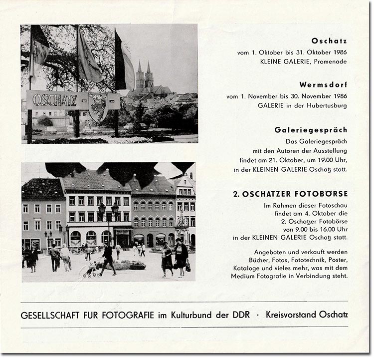 ![]() ![]() ![]() ![]() OSCHATZ – DETAILS EINER STADT Begleitheft zu einer Fotoschau im Jahr 1986 Sammlung: Gerald Polster |