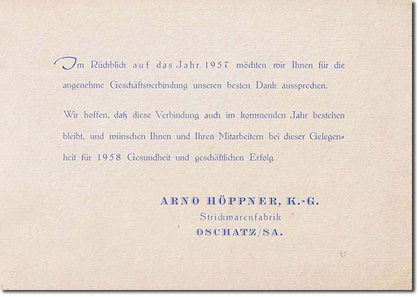 GLÜCKWUNSCHKARTE zum Jahreswechsel 1957/1958 der Strickwarenfabrik Arno Höppner KG Sammlung: Gerald Polster |