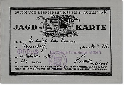 JAGD-KARTE gültig vom 1.09.1931 bis 31.08.1932, ausgestellt von der Amtshautmannschaft Oschatz Sammlung: Klaus Thiele |
