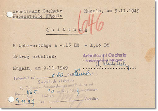 QUITTUNG VOM ARBEITSAMT OSCHATZ NEBENSTELLE MÜGELN vom 09.11.1949 für 8 Lehrverträge Leihgabe von Klaus Thiele, Merkwitz |