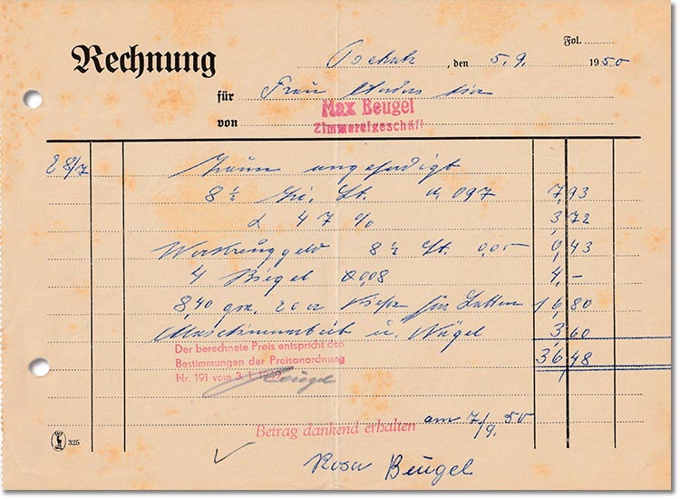 28.07.1950: Zaun angefertigt, Werkzeuggeld, 4 Riegel 8,4 qm Kiefern für Latten, Maschinenarbeit und Nägel = 36,48