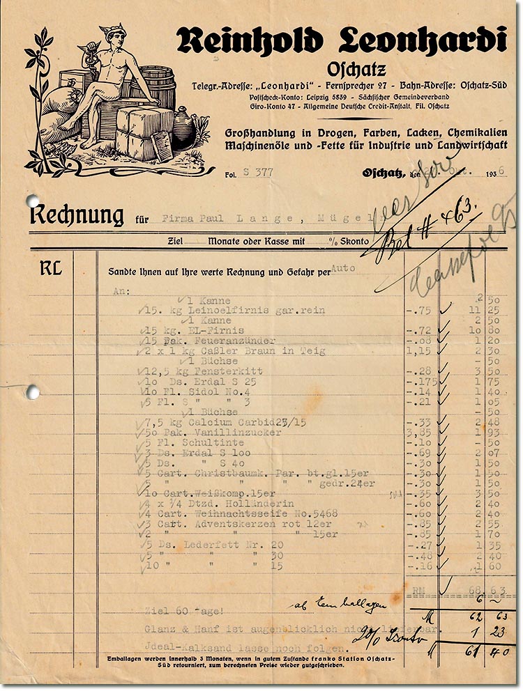 | REINHOLD LEONHARDI, Drogen, Farben, Lacke Rechnung vom 27.10.1936 Sammlung: Gerald Polster |