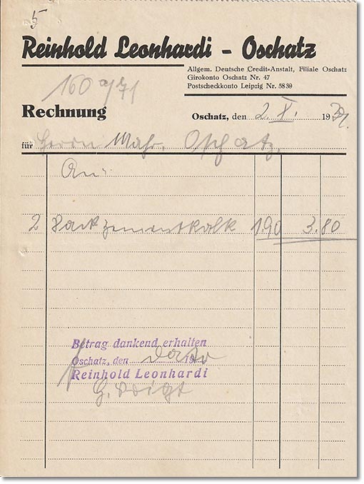 REINHOLD LEONHARDI, Drogen, Farben, Lacke Rechnung vom 02.10.1939 für 2 Sack Zementkalk = RM 3,80 Sammlung: Gerald Polster |