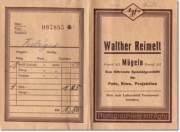 Fotomappe des Spezialgeschäfts für Foto, Kino Projektion Walther Reimelt, Mügeln Das Jahr ist unbekannt, Die Preise sind aber noch in Reichsmark angegeben. Sammlung: Matthias Fiebiger, Stauchitz  |