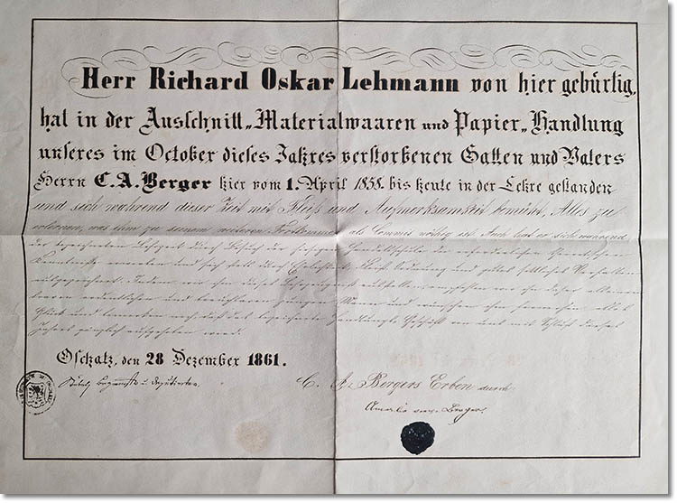 Herr Richard Oskar Lehmann von hier gebürtig hat in der Ausschnitt-Materialwaaren