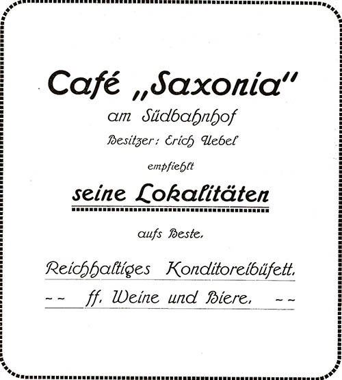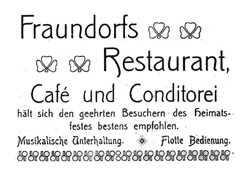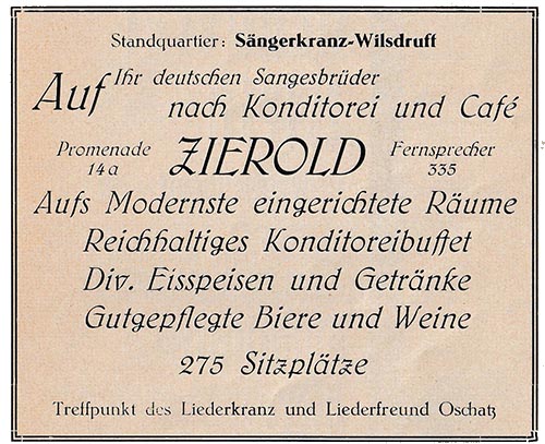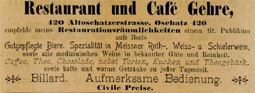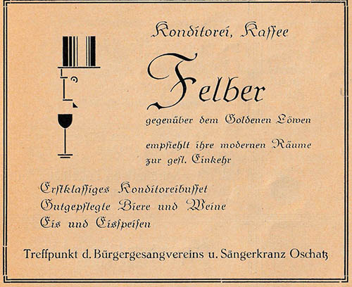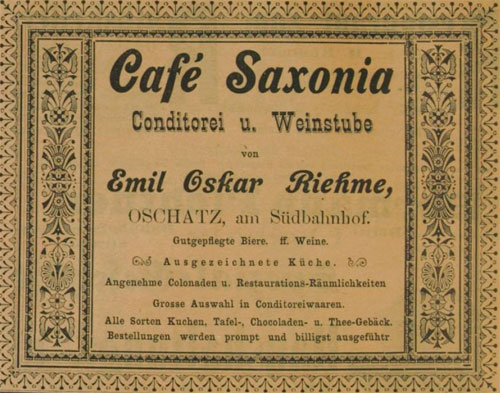 ![]() Conditorei und Café Bruno Hofmann aus Einwohnerverzeichnis Oschatz 1895 ![]() Restaurant und Café Gehre aus Einwohnerverzeichnis Oschatz 1895 Anm.: Oschatz 420 war nicht in der Altoschatzer Straße sondern am Altoschatzer Platz (heute Miltitzplatz 3) tit. Publikum = tituliertes Publikum steht für, verehrtes, gut situiertes Publikum ![]() Conditorei u. Café Alfred Felber aus Einwohnerverzeichnis Oschatz 1922 ![]() Konditorei, Kaffee Felber entdeckt von Gerald Polster in „Festbuch zum Sängerfest“ 1927 ![]() Bäckermeister Franz Hirschel aus: Einwohnerverzeichnis Oschatz 1904 ![]() Fraundorfs Restaurant, Café und Conditorei aus „Erinnerungsblatt an das Heimatfest zu Oschatz“ 1906 ![]() Conditorei und Café Max Löbner aus Einwohnerverzeichnis Oschatz 1911 ![]() Bäckermeister und Conditor Otto Emil Nitzschner aus Einwohnerverzeichnis Oschatz 1904 |