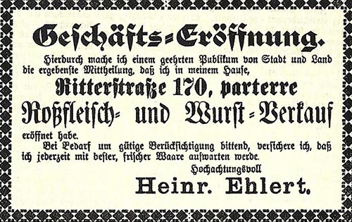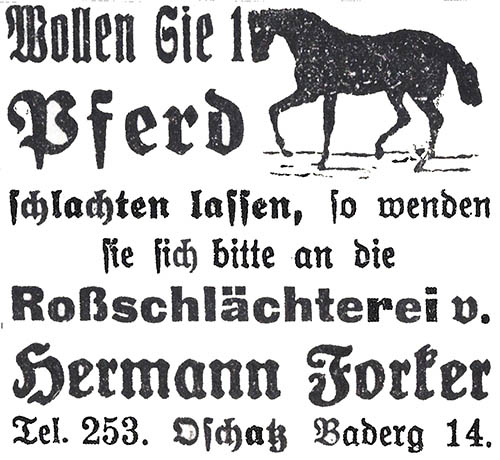 ![]() Fleischermeister Franz Haupt aus „Erinnerungsblatt an das Heimatfest zu Oschatz“ 1906 ![]() Delikatessgeschäft Robert Hardt aus Militäradressbuch für Sachsen, XII. u. XIV Armeecorps, Ausgabe 1909 ![]() Fleischermeister Bruno Donat aus „ Oschatz und Umgebung“ 1927 ![]() Freibank Schlachthof Oschatz entdeckt von Andres Garbe in „Oschatzer Tageblatt“ von November 1938 ![]() Schade, Lonnewitz entdeckt von Andres Garbe in „Oschatzer Tageblatt“ von November 1938 ![]() OTTO SCHUBERT, Fleischerei und Gastwirtschaft entdeckt von Gerald Polster im Festbuch zum Sängerfest 1927 ![]() Rossschlächterei von Hermann Forker Anzeige von 1923 aus: Oschatzer Ansichten, Sammlung Stadtarchiv Oschatz ![]() Rossfleisch- und Wurstverkauf Heinr. Ehlert Anzeige von 1891 aus: Oschatzer Ansichten, Sammlung Stadtarchiv Oschatz |