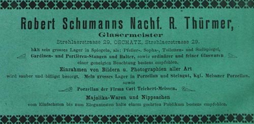 Robert Schumanns Nachf. R. Thürmer, Glasermeister aus Einwohnerverzeichnis Oschatz 1904 Klara Minna Böttger aus „Oschatz und Umgebung“ 1927 Paul Freudrich, Inhaber Kurt Freudrich aus Einwohnerverzeichnis Oschatz 1931