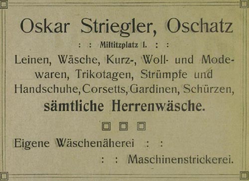 ![]() Kürschnermeister Carl Riebisch aus: Einwohnerverzeichnis Oschatz 1895 ![]() O. Kayser, Inhaber Joh. Goldmann aus: Einwohnerverzeichnis Oschatz 1922 ![]() Handschuhmacher Otto Kayser, Inhaber Joh. Goldmann aus „ Oschatz und Umgebung“, 1927 ![]() Richard Kunze, vormals Ernestine Mierisch aus „Erinnerungsblatt an das Heimatfest zu Oschatz“ 1906 |