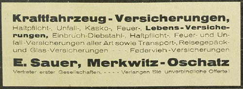 Kraftfahrzeug-Versicherungen E. Sauer, Merkwitz aus Einwohnerverzeichnis Oschatz 1931 |