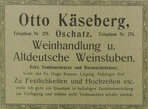 ![]() Weingroßhandlung Adolf Rossberg aus Einwohnerverzeichnis Oschatz 1904 ![]() Richard Naumann, Emil Rocher Nachf. aus Einwohnerverzeichnis Oschatz 1904 ![]() Hermann Bock aus Einwohnerverzeichnis Oschatz 1895 ![]() Ernst Knape aus „Erinnerungsblatt an das Heimatfest zu Oschatz“ 1906 ![]() Ernst Knape entdeckt von Gerald Polster in „Festbuch zum Sängerfest“ 1927 ![]() Rudolf Roeber aus „Erinnerungsblatt an das Heimatfest zu Oschatz“ 1906 ![]() Weinhandlung und Altdeutsche Weistuben Otto Käseberg aus Einwohnerverzeichnis Oschatz 1911 ![]() Weinhandlung Otto Käseberg aus „Oschatz mit dem Orte Zschöllau sowie die Umgebung in Wort und Bild“ 1913 ![]() Richard Marthaus aus Einwohnerverzeichnis Oschatz 1895 ![]() Delikatessgeschäft Robert Hardt aus Militäradressbuch für Sachsen, XII. u. XIV Armeecorps, Ausgabe 1909 ![]() F.W. Bergmann's Nachfolger, Inhaber Otto Ehlert aus „Erinnerungsblatt an das Heimatfest zu Oschatz“ 1906 |