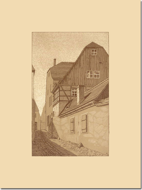 GÄSSCHEN Diese Grafiken stammen aus einer Mappe mit 18 Blättern Oschatz. "Bilder aus einer Stadt Sachsens" Herausgegeben und verlegt bei Fedor Göthel, Oschatz anlässlich des Heimatfestes von 1906. Sammlung: © Stadt- und Waagenmuseum Oschatz / digitalisiert von Dr. Manfred Schollmeyer, Oschatz online gestellt: 24.09.2011 |
