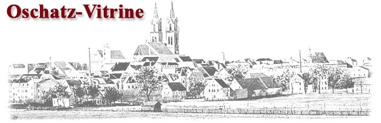 | In der Oschatz-Vitrine werden Erinnerungs- und Sammlerstücke aus der Zeit von 1793 bis 1989 ausgestellt. |