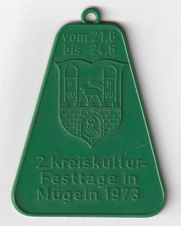 Plastik-Plakette zum 100jährigen Jubiläum der Freiwilligen Feuerwehr Mügeln und zu den 2. Kulturfesttagen in Mügeln 1973 vom 21.06. bis 24.06.1973 Sammlung: Klaus Thiele