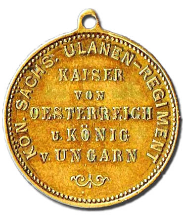 ANDENKEN AN DIE GRÜNDUNG 1867 Kön. Sachs. Ulanen-Regiment „Kaiser von Oesterreich u. König von Ungarn“ Dieser Medaillenanhänger wurde vermutlich ab 1891 geprägt, denn erst am 21. November 1891 erfolgte die Umbenennung des Regiments in „1. Kgl. Sächs. Ul.Reg. 17 „Kaiser Franz Joseph von Österreich, König von Ungarn“ Sammlung: Eckhard Thiem |