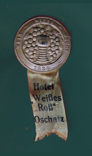 ZUR WEIN-WERBE-WOCHE 1936 IM HOTEL „WEISSES ROSS“ Dieser Anhänger wurde auf Karton geprägt. Leihgabe von Gerald Polster, Oschatz |