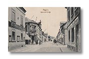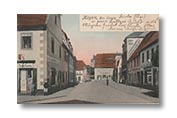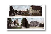 Zwei Ansichten vom Kleinen Ratszwinger, 3 Fotos aus Mügeln und eines aus der Seminarstraße sowie eine handkolorierte Lithografie der Kirchen und Hauptgebäude von Oschatz – und Anzeigen aus dem Erinnerungsblatt zum Heimatfest 1906.