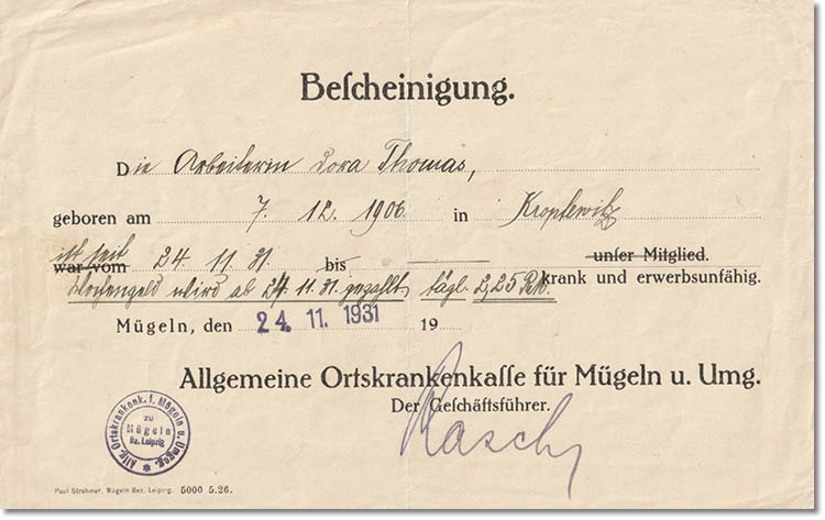 KRANKHEITSBESCHEINIGUNG der AOK für Mügeln und Umgebung 1931 Sammlung: Klaus Thiele |