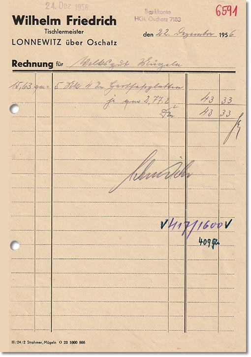 FRIEDRICH Tischlermeister, Lonnewitz 22. Dezember 1956 5 Stck. Hartfaserplatten 15,63 qm DM 43,33 Sammlung: Klaus Thiele |