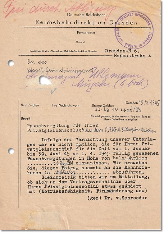 DEUTSCHE REICHSBAHN Reichsbahndirektion Dresden, Güterkasse Mügeln (b. Oschatz), 15.07.1945 Sammlung: Klaus Thiele |