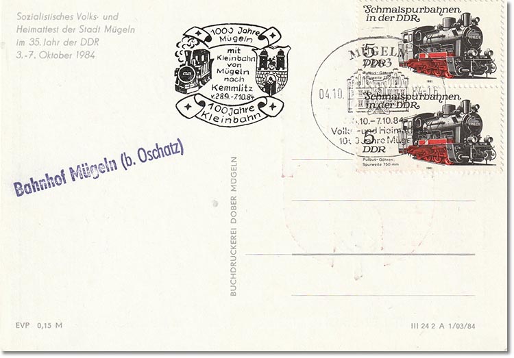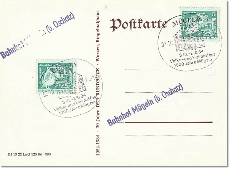 Sonderstempel zum Volks- und Heimatfest anlässlich „1000 Jahre Mügeln“, 3. bis 7. Oktober 1984 |