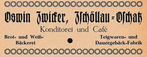 ![]() Conditorei und Café Bruno Hofmann aus Einwohnerverzeichnis Oschatz 1895 ![]() Restaurant und Café Gehre aus Einwohnerverzeichnis Oschatz 1895 Anm.: Oschatz 420 war nicht in der Altoschatzer Straße sondern am Altoschatzer Platz (heute Miltitzplatz 3) tit. Publikum = tituliertes Publikum steht für, verehrtes, gut situiertes Publikum ![]() Conditorei u. Café Alfred Felber aus Einwohnerverzeichnis Oschatz 1922 ![]() Konditorei, Kaffee Felber entdeckt von Gerald Polster in „Festbuch zum Sängerfest“ 1927 ![]() Bäckermeister Franz Hirschel aus: Einwohnerverzeichnis Oschatz 1904 ![]() Fraundorfs Restaurant, Café und Conditorei aus „Erinnerungsblatt an das Heimatfest zu Oschatz“ 1906 ![]() Conditorei und Café Max Löbner aus Einwohnerverzeichnis Oschatz 1911 ![]() Bäckermeister und Conditor Otto Emil Nitzschner aus Einwohnerverzeichnis Oschatz 1904 |