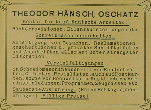 Theodor Hänsch, Kontor für kaufmännische Arbeiten aus Einwohnerverzeichnis Oschatz 1911 |