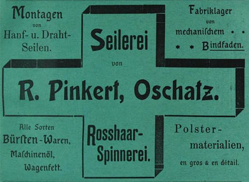 ![]() Reinhold Pinkert, Seilerei, Rosshaarspinnerei aus Einwohnerverzeichnis Oschatz 1904 |