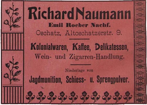![]() August Arthur Eichler, vorm. Wilhelm Paul Gregor aus: Einwohnerverzeichnis Oschatz 1895 ![]() Kurt Freudrich aus Einwohnerverzeichnis Oschatz 1931 ![]() Kaufmann Richard Herrig aus: Einwohnerverzeichnis Oschatz 1895 ![]() Kurt Hoffmann entdeckt von Eckhard Thiem in: Broschüre „Kunstausstellung in Oschatz“, 1948 ![]() Kaufmann Maximilian Roßberg aus Einwohnerverzeichnis Oschatz 1895 ![]() Albin Lahl aus Einwohnerverzeichnis Oschatz 1895 ![]() Eugen Pohl, vormals Wilhelm Kümmel aus Einwohnerverzeichnis Oschatz 1922 ![]() Paul Rädel aus „Erinnerungsblatt an das Heimatfest zu Oschatz“ 1906 ![]() Rudolf Roeber aus „Erinnerungsblatt an das Heimatfest zu Oschatz“ 1906 ![]() Max Richter entdeckt von Gerald Polster in „Festbuch zum Sängerfest“ 1927 |