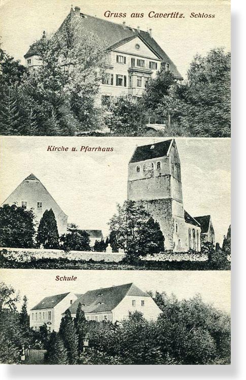 GRUSS AUS CAVERTITZVerlag: Wilhelm Winkler, LeipzigNr. 19143 unbeschrieben Sammlung: Horst Kohl Schloss, Kirche und Pfarramt, Schule online gestellt: 25.07.2009