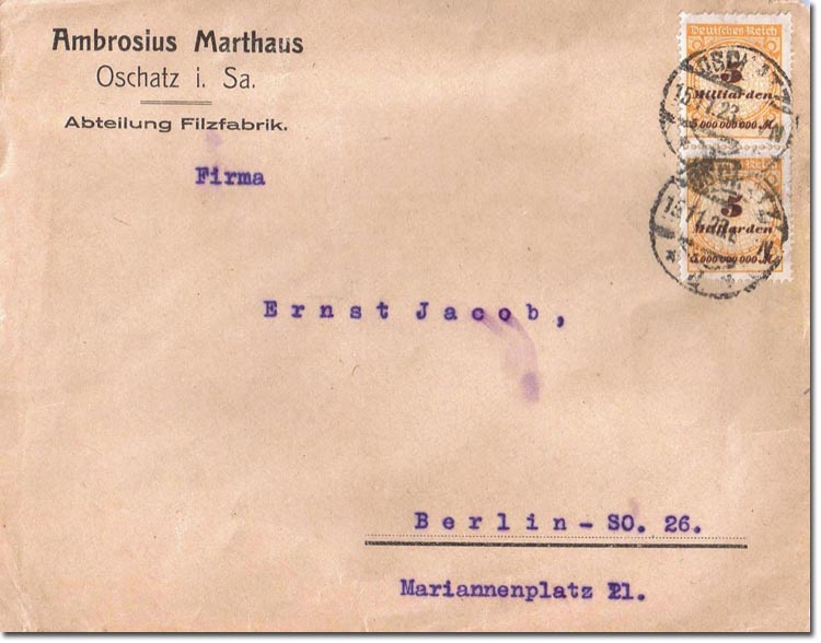 | Absender: Ambrosius Marthaus, Oschatz, Abteilung Filzfabrik