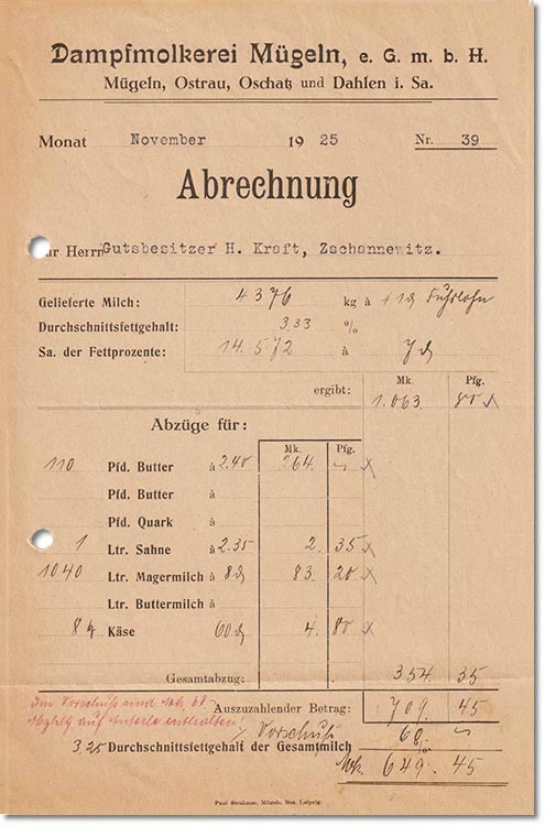 Dampfmolkerei Mügeln e.G.m.b.H. Abrechnung für Nov. 1925 Leihgabe von Klaus Thiele, Merkwitz |