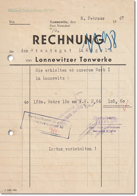 Lonnewitzer Tonwerke Rechnung vom 08.02.1947 Leihgabe von Klaus Thiele, Merkwitz |