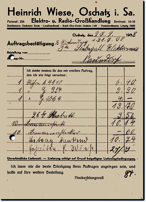 Heinrich Wiese Elektro- und Radio- Großhandel Rechnung vom 27.09.1938 für 1 Röhre A 4110 1 Röhre G 354 ! Röhre G 1064 - 26% Rabatt 10 Bananenstecker Leihgabe von Klaus Thiele, Merkwitz |