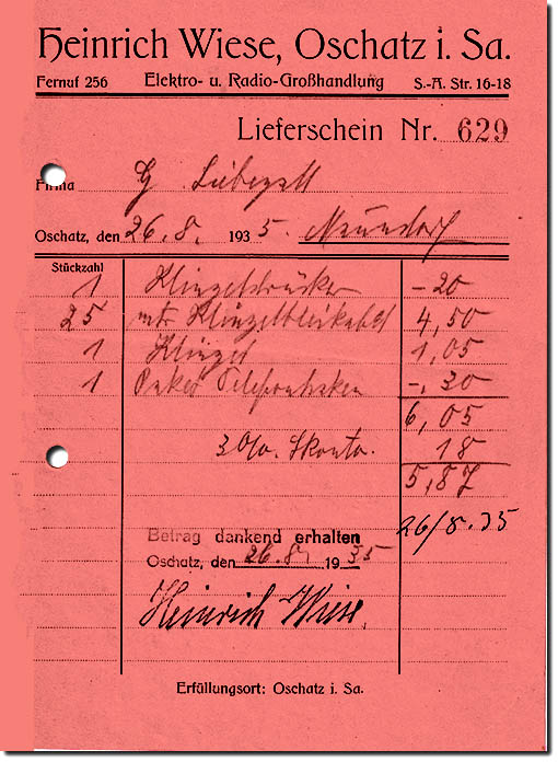 Heinrich Wiese Elektro- und Radio- Großhandel Rechnung vom 26.08.1935 für 1 Klingeldrücker 25m Klingeltürkabel 1 Klingel 1 Paket Schieferhaken Leihgabe von Klaus Thiele, Merkwitz |