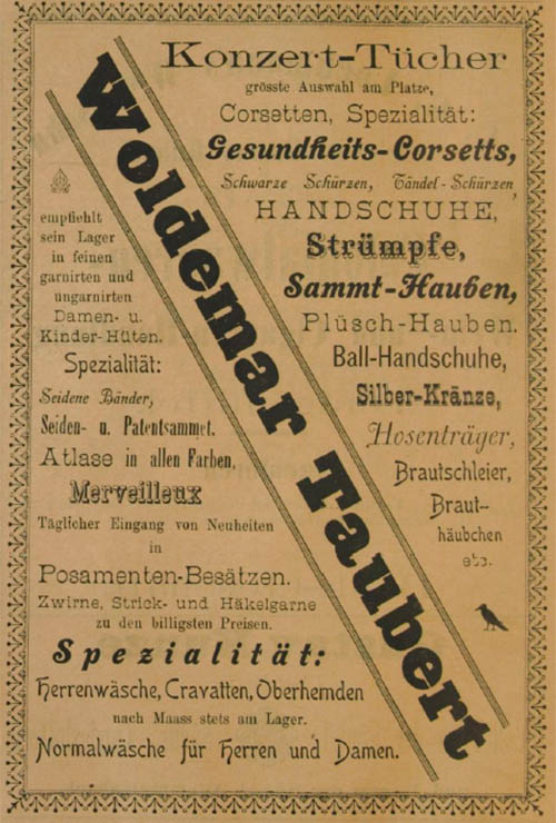 ![]() Wollwarenhändlerin Marie Kühn aus: Einwohnerverzeichnis Oschatz 1895 ![]() Woldemar Taubert aus: Einwohnerverzeichnis Oschatz 1895 ![]() Richard Kunze, vormals Ernestine Mierisch aus „Erinnerungsblatt an das Heimatfest zu Oschatz“ 1906 ![]() Modehaus Figol, Inhaberin Charlotte Pötzsch entdeckt von Tilo Gerber in: „Die Union“ vom 27.11.1955 ![]() Modehaus Richard Lauch, Inhaber Ernst Köllmer aus: Einwohnerverzeichnis Oschatz 1922 ![]() Wollwarengeschäft Minna Linke aus „ Oschatz und Umgebung“, 1927 |